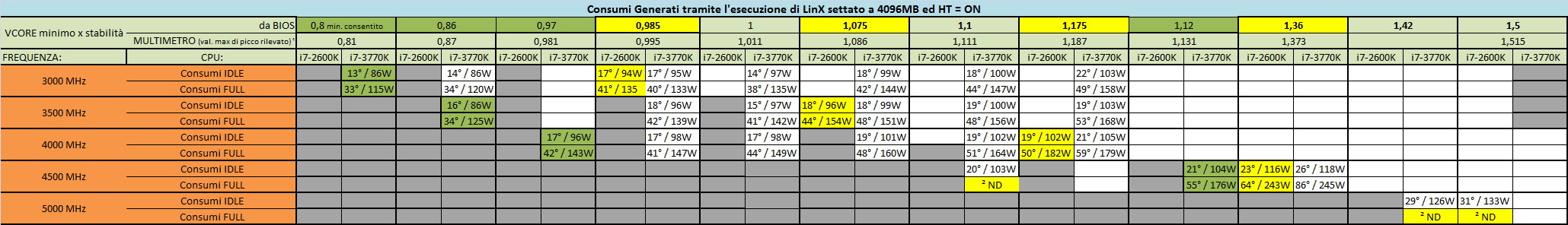 In giallo sono contraddistinti i valori ottenuti con il minimo Vocre stabile per Sandy Bridge; in verde per Ivy Bridge.