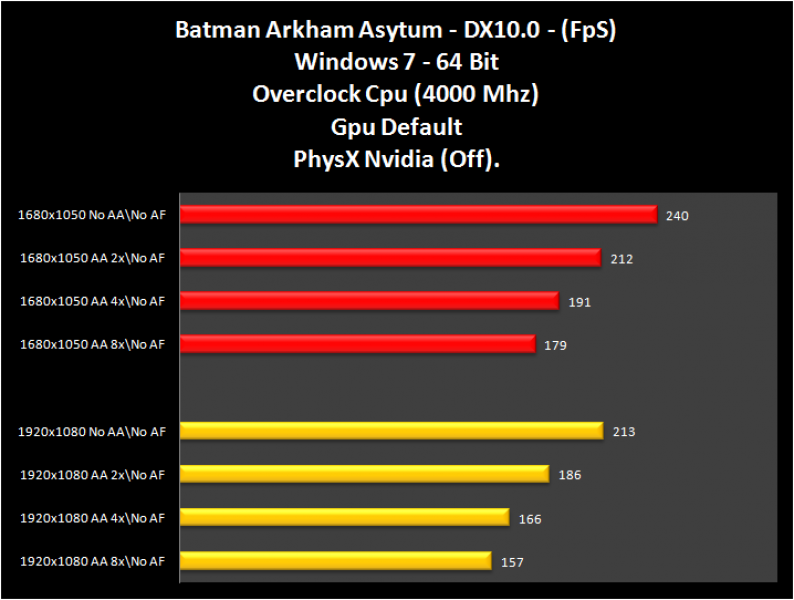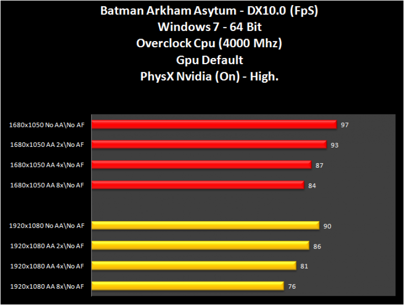 Il gioco Batman Arkham Asylum, che supporta la tecnologia PhysX di Nvidia, si è comportato decisamente bene. Certo, il calo c’è stato attivando PhysX, ma nel complesso il risultato è stato buono.